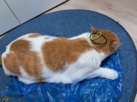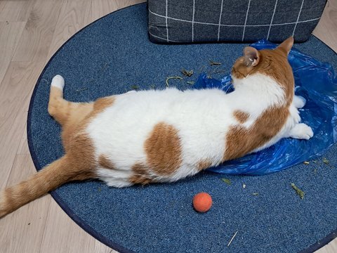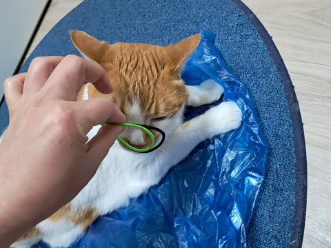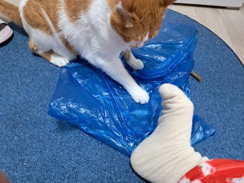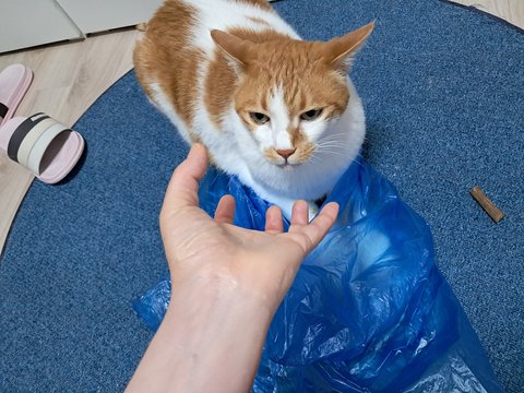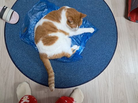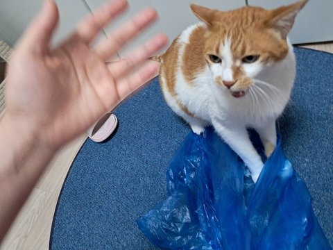 집사 출근하기 전에 비닐봉지와 사랑에 빠진 도칠이 궁디팡팡 해주고 있음.
