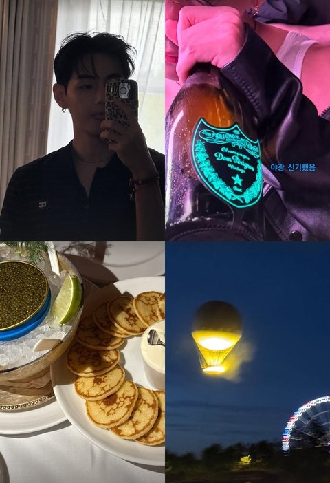 공개된 사진에는 뷔가 럭셔리한 분위기의 와인 파티에서 유쾌한 시간을 보내는 모습이 담겨 있다. 거울 앞에서 조각 같은 외모를 자신의 카메라에 담는 모습도 공개했다.