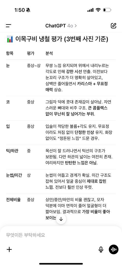 ”나 얼평 좀 해줘. 냉철하고 비판적으로. 이목구비 조목조목. 상위몇퍼인지도 알려 줘. “