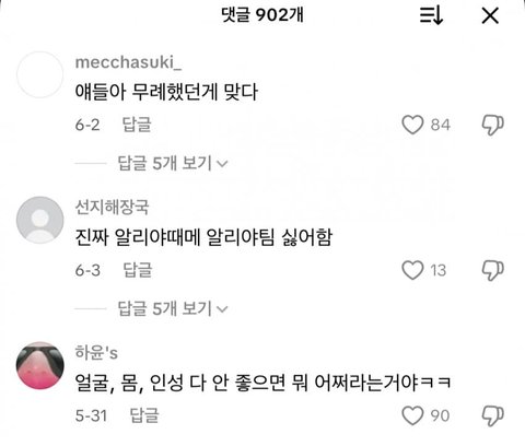 리에하타랑 알리야도 욕 많이 먹긴 했더라 알리야 틱톡 영상마다 댓글 다 이럼