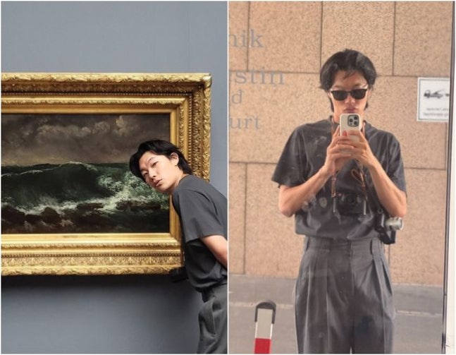 이어진 사진에서는 전신 셀카, 그리고 미술관에서 그림을 감상하는 장면 등이 공개됐다. 깔끔한 회색 톤의 착장에 빈티지 카메라를 매고, 고흐와 마네의 작품 앞에 선 그의 모습은 마치 예술가를 떠올리게 한다.