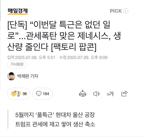 [단독] “이번달 특근은 없던 일로”...관세폭탄 맞은 제네시스, 생산량 줄인다 [팩토리 팝콘] - 매일경제