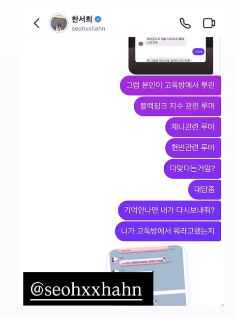 +설명: 강남주님이 한서희한테 고독방에서 한서희 니가 블랙핑크 제니 루머,블랙핑크 지수 루머,스키즈 현진 루머 얘기한거 다 맞냐고 예,아니요 라고 대답하라고 계속 말했는데 한서희는 계속 회피하면서 계속 동문서답을 한 디엠 내용이 다 털림