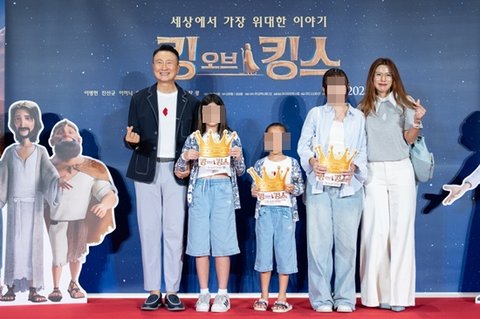 2006년 결혼한 아내 이윤미, 세 딸과 함께 포토월 앞에 선 주영훈은 건강 상태에 대해 "완전히 낫지는 않았는데 이 자리에 달려오게 됐다"며 환한 표정으로 영화 관람을 독려했다.