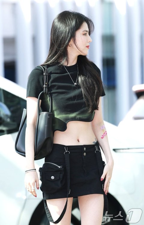 한소희는 한 줌 개미허리가 돋보이는 유니크한 블랙 상의에 미니 스커트를 입고 나타났다. 특히 허리 라인에 살짝 보이는 타투와 팔뚝에 붙인 밴드로 특유의 시크함을 더했다.