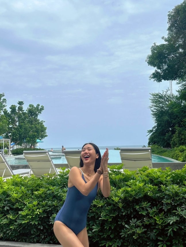 풀장 옆, 미미의 환한 웃음과 박수치는 포즈는 보는 이까지 기분 좋아지게 한다. 자유로우면서도 건강미 넘치는 매력을 드러내고있다.