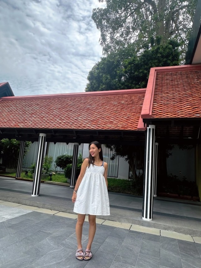 화이트 베이비돌 원피스를 입은 미미는 수영장에서 벗어나 러블리한 무드로 전환했다. A라인으로 넓게 퍼지는 드레스와 밝은 표정, 편안한 자세가 무더운 여름조차 잊게 만든다.