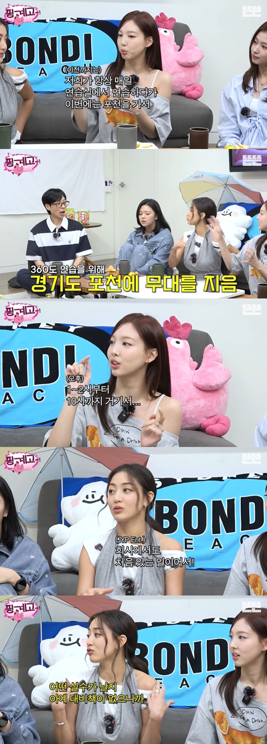 공개된 영상에서 나연은 "이전까지는 저희가 항상 매일 연습실에서 연습을 하다가 이번에는 (경기도) 포천에 가서 아예 무대를 지어서 리프트나 이런 걸 다 타보면서 (오후) 1~2시부터 10시까지 거기서 (연습을 했다)"고 말했다.