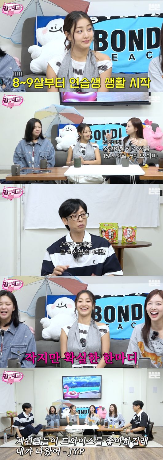 나연 역시 "중학교 2-3학년에 들어와서 정연이랑 입사 15년 동기"라고 밝혔고, 사나는 "중학교 졸업하고 바로 왔다"라며 입사 13년을 자랑했다.