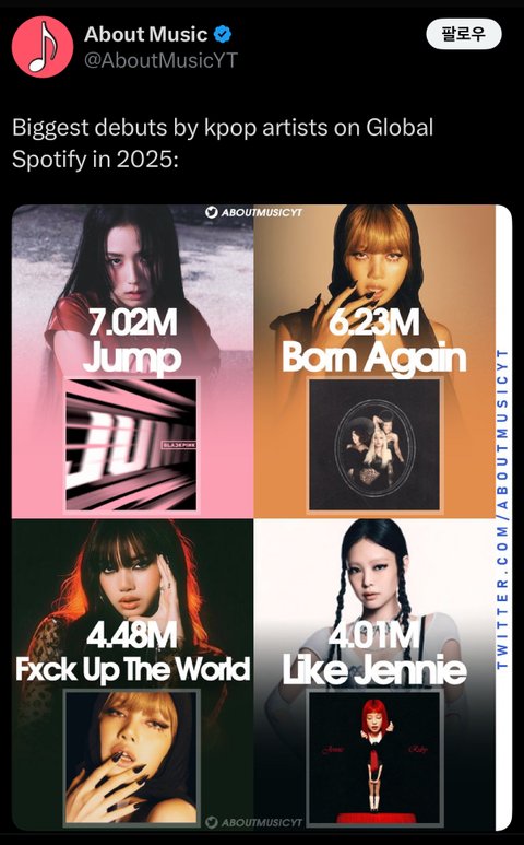 블핑 올해 전세계 여가수 통틀어 최고 데뷔 수치임
