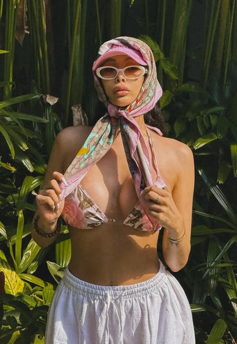 무엇보다 탄탄한 몸매가 돋보이는 과감한 비키니 스타일이 시선을 사로잡는다. 특히 뒷모습을 과감하게 드러내며, 등에 새겨진 문신과 엉덩이 부근의 타투가 눈길을 끈다.