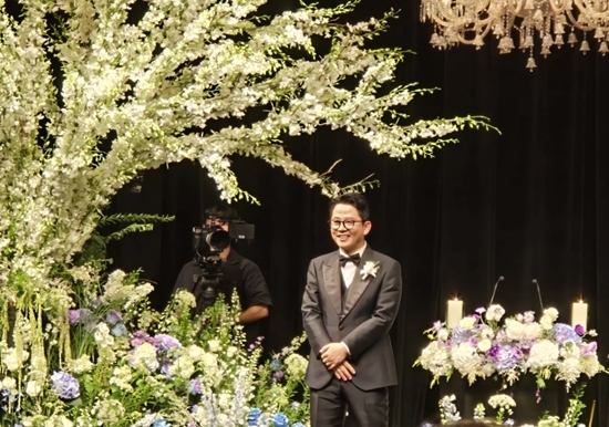 두 번째 컷에선 김준호가 환하게 웃고 있다. 무대 위엔 연보라색과 흰색 생화가 가득했고, 그 앞에서 그는 턱시도를 단정히 여미고 있다. 마치 오늘이 오래 기다려온, 그리고 당연히 와야 했던 하루처럼. 웃음은 무대 위를 넘어 객석까지 퍼졌다.