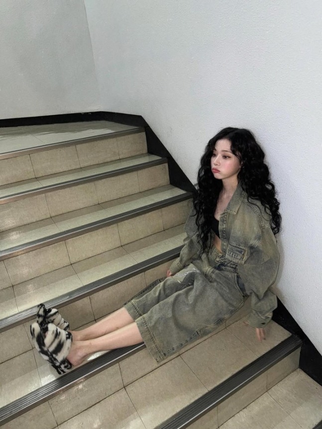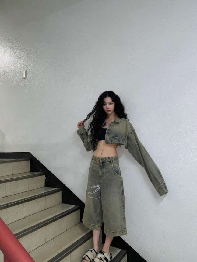 특히 마지막 컷에서는 윈터의 비현실적인 비율이 단연 돋보인다. 크롭 자켓과 통 넓은 데님 팬츠의 조합은 Y2K 스트릿 무드를 풍기며, 발끝의 퍼 슬리퍼까지 빈틈없는 스타일링을 보여줬다.
