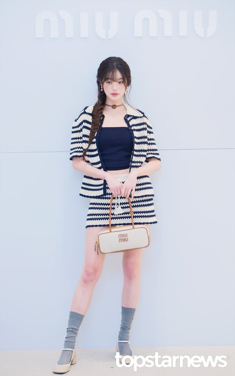 이날 장원영은 네이비와 아이보리 컬러가 조화를 이룬 니트 투피스에 크림 컬러의 미우미우 핸드백, 브라운 플라워 초커로 포인트를 더한 스타일링으로 시선을 사로잡았다. 길게 땋은 헤어스타일과 자연스러운 메이크업이 우아한 분위기를 완성했다.