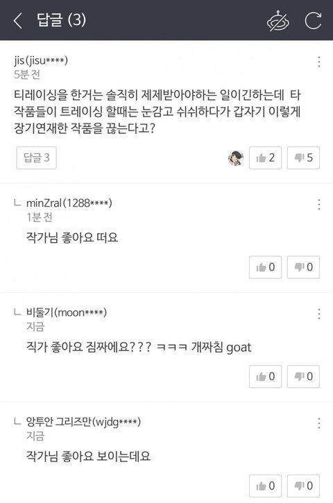 근데 심지어 네이버 앱 업데이트되면서 작가들 아이디는 옆에 초록색 체크표시 뜨는데 다른 네웹 작가들이 트레 옹호한 댓글 쓴 것도 걸리고
