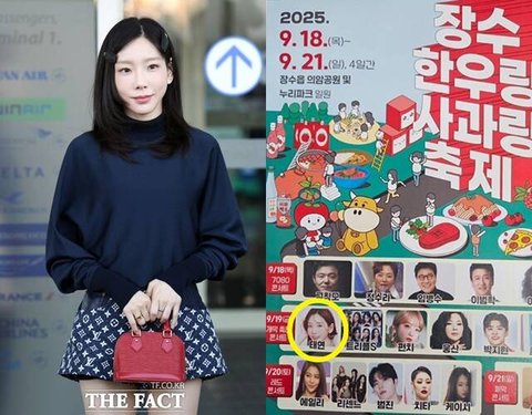 지난 14일 온라인 커뮤니티를 통해 오는 9월 18일부터 21일까지 진행되는 '장수 한우랑 사과랑 축제' 포스터가 확산된 가운데 해당 사진 속 출연진 라인업에 태연의 이름과 사진이 담겨 있어 화제를 모았다.