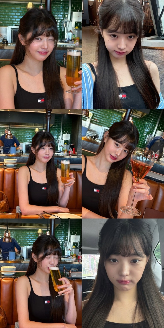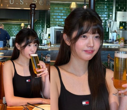 맥주잔을 들고 눈을 감은 채 미소 짓는 모습은 광고를 연상케 해 팬들의 마음을 울린 장원영은 긴 생머리와 뱅 앞머리로 귀여운 매력을 더했다.