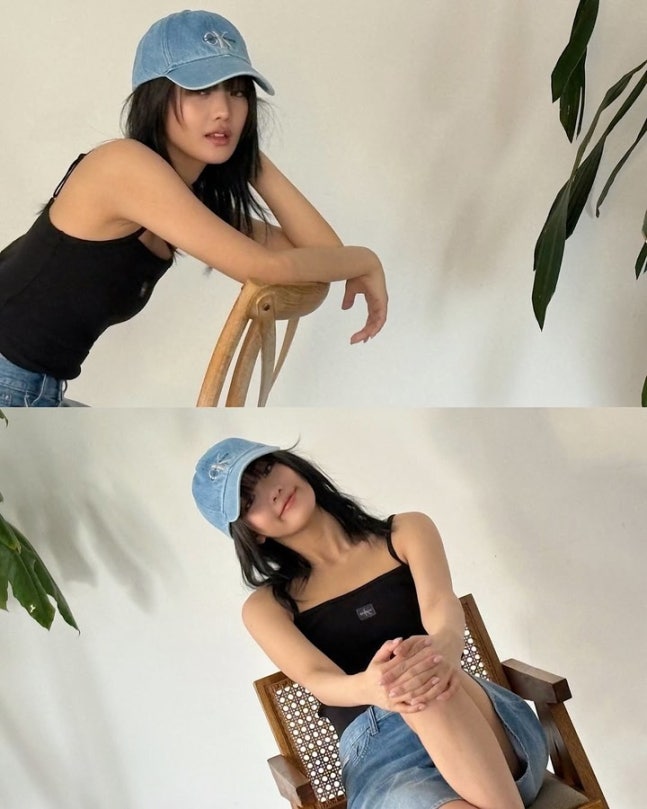 이전과는 또 다른 느낌의 데일리 룩이다. 블랙 슬리브리스 탑과 데님 숏팬츠에 연청 캡 모자를 매치해 캐주얼하면서도 발랄한 분위기를 연출했다.