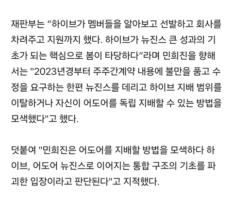 처벌만 안 받을 뿐이지 법원피셜 민희진이 뉴진스 들고 나르려고 한 건 팩트 땅땅임ㅋ 방시혁이야 깜방가든 말든 알빠야ㅋㅋㅋㅋ
