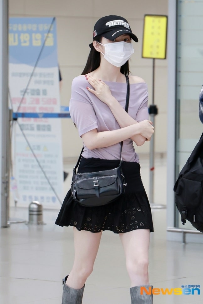 한소희이날 한소희는 연보라색의 오프숄더 상의에 블랙 미니스커트로 여리여리한 무드를 강조했다. 여기에 한소희는 롱부츠와 블랙캡을 매치해 시크한 매력도 더했다.