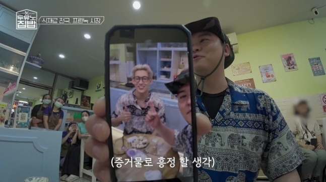 MBN, MBC에브리원 ‘두유노집밥’선착장에 내리자마자, 뱀뱀은 “위액이 요동친다”며 배고파하는 이장우를 위해 타이티(태국식 냉차)와 연유를 듬뿍 뿌린 태국식 팬케이크 로띠를 주문했다. 달콤하게 에너지를 충전한 두 사람은 도로 전체가 노점으로 빼곡한 ‘왕랑 시장’에 들어섰다. ‘킁킁 장우’ 모드가 발동한 이장우는 향만 맡고도 맛집을 직감하며 먹방 안테나를 세웠고, 돼지고기 식빵 튀김, 태국식 크레페, 코코넛 푸딩, 닭튀김, 생선살 튀김 등 거침없는 먹방을 이어갔다. 폭풍 먹방 후 우연히 옷가게를 발견한 이장우는 “땀으로 옷이 다 젖었는데 잘됐다”며 즉석에서 옷을 샀다. 코끼리 프린팅 현지복으로 갈아입은 이장우는 “완전 시원해”라며 만족스러워했고, 뱀뱀도 같은 옷을 골라 ‘코끼리 커플룩’을 완성시켰다.