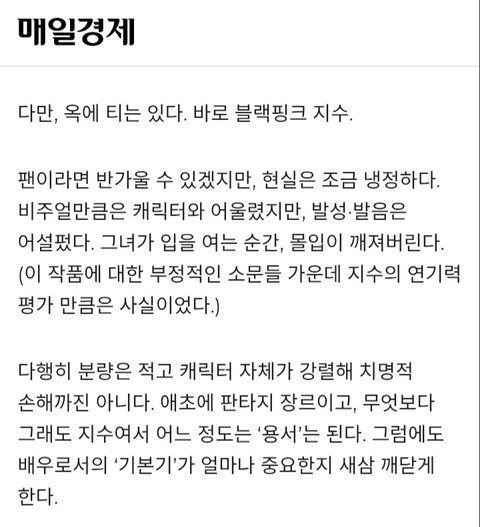 솔직히 이건 일부로 억까하는거같음 분량 5분이면 지수 말고 다른 배우가 똑같이 연기했으면 기자가 언급도 안했을거임 스냥 지수라서 일부로 언급한듯