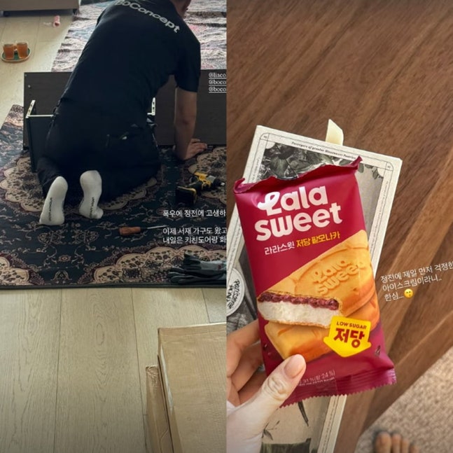 공개된 사진 속에는 효민의 신혼집에 가구들이 도착해 방문 업체 직원들이 이를 조립해 주고 있는 모습. 특히 효민은 폭우를 뚫고 자신의 집에 왔으나 정전으로 인해 뜻밖의 고생을 더하고 있는 직원들에 미안했는지 시원한 음료 두 잔을 컵에 정성스레 담아두어 눈길을 끌었다.