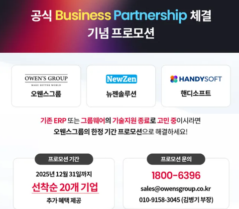 이번 파트너십 체결을 기념하여 오웬스그룹은 2025년 12월 31일까지 선착순 20개 기업을 대상으로 파격적인 프로모션을 진행합니다. 기존 ERP 및 그룹웨어의 기술 지원 종료나 시스템 노후화로 어려움을 겪는 기업들을 위해 마련된 이번 기회는 합리적인 비용으로 최적의 솔루션을 제공합니다.