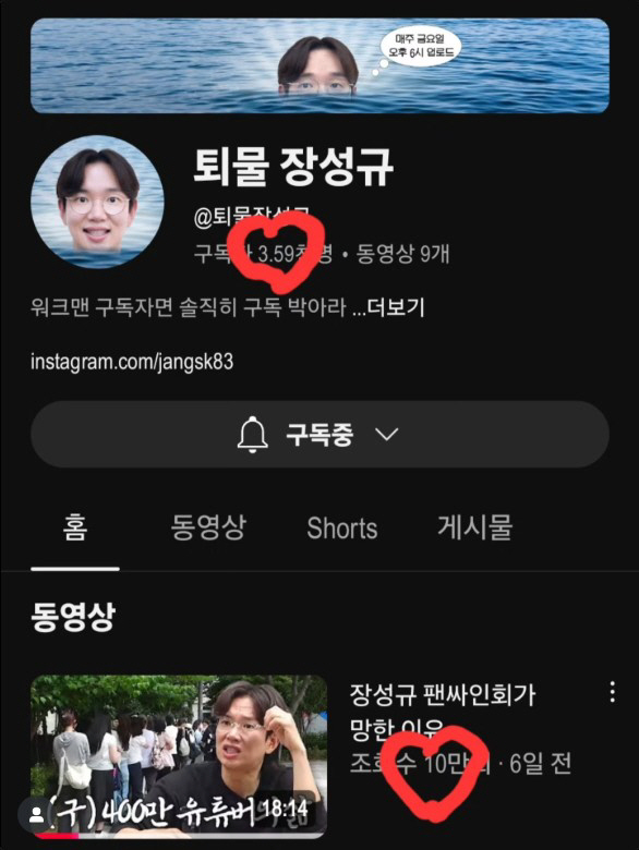 공개된 이미지에는 장성규의 유튜브 채널이 구독자 3.59천명을 기록하고 있으며, 영상 중 하나가 조회수 10만을 돌파한 모습이 담겼다.