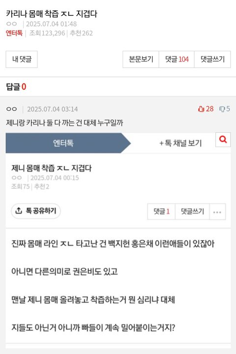 애들아 저거 디시하는 카리나 팬이야.. 무조건 카리나 까글 올라오면 그날 하루종일 제니 윈터로 복붙해서 그대로 올림. 못믿겠으면 디시 블랙핑크갤러리랑 남연갤가봐 거기서 하루종일 죽치고 제니랑 윈터패고 있음 진짜 카리나 팬들은 카리나 쳐맞으면 꼭 타돌 머리채잡음. 고소당해야됨 ㄹㅇ싸패단패악질