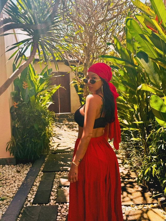 제시는 블랙 브라톱과 강렬한 레드 컬러의 롱스커트, 그리고 머리를 감싼 같은 색 스카프로 시선을 사로잡았다. 볼드한 골드 이어링과 선글라스를 더해 트로피컬 감성을 배가시켰으며, 탄탄한 복근과 볼륨감 넘치는 몸매로 건강미를 드러냈다.