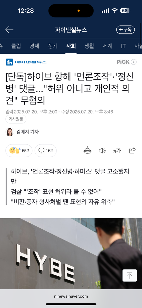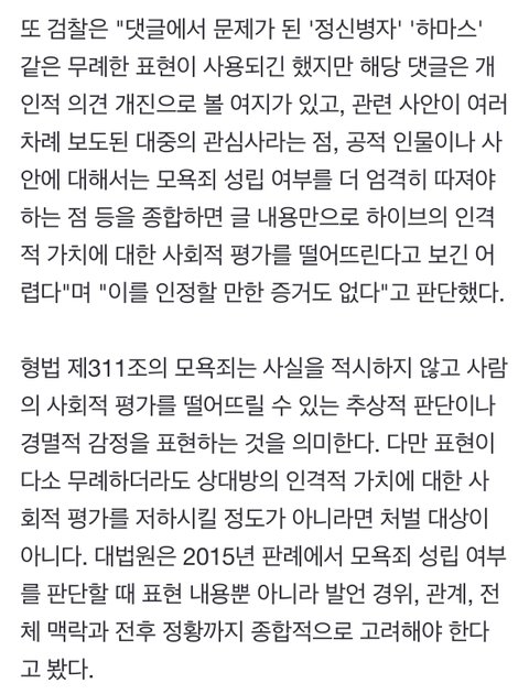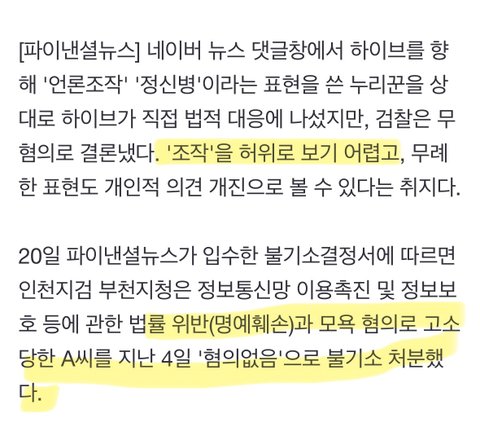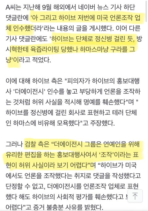어떤 사람이 하이브 상대로 악플 쓴 거(여론 조작 업체 인수 한거+걍 욕하는 댓글) 하이브측에서 명예훼손이라고 고소했는데 무혐의 처분 받음