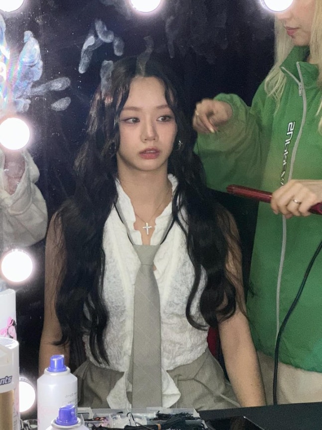 드레싱룸 조명 아래서 헤어 스타일링을 받고 있는 혜리의 무표정은 오히려 보는 이를 끌어당기는 시크한 무드로 연출됐다.