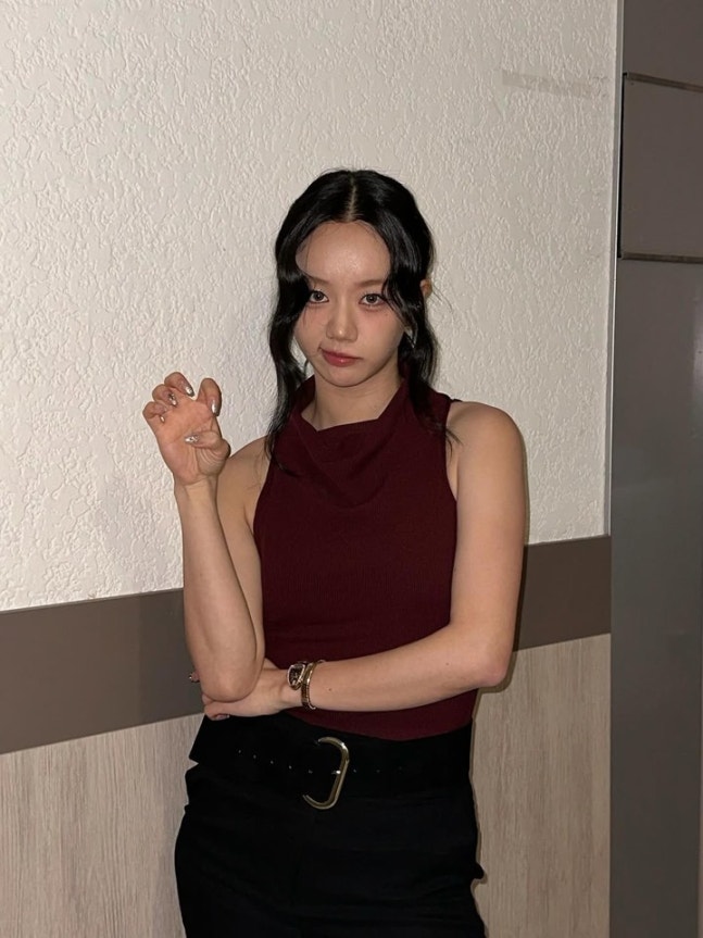 마지막 사진에서는 버건디 민소매 탑과 하이웨스트 블랙 슬랙스의 조합은 성숙한 여성미를 강조했다.