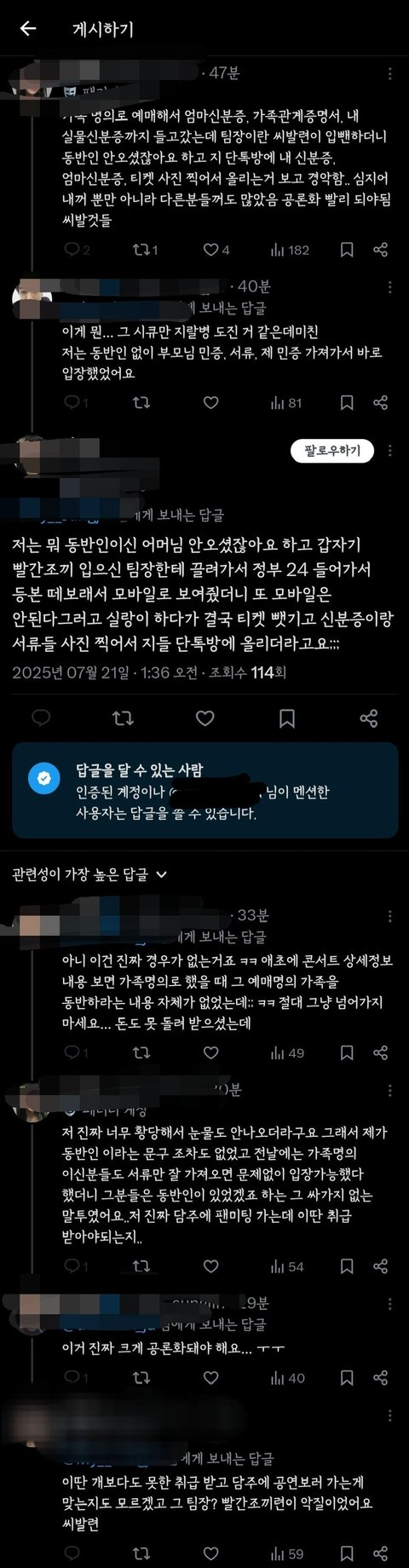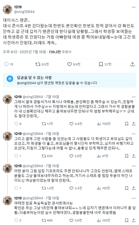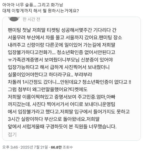 데식만 그런줄 알아? 난 스키즈 팬인데, 암표사서 온 즁국인들은 다 들여보내고 한국인들은 주민번호 대봐라 주소 대봐라 하면서 본인확인 엄청하고 나서야 들여보내줌. 모바일 신분증이 사람이 많아서인지 로딩이 잘 안되서 좀 버벅거렸더니 눈치주고.. 다른 신용카드 이름 보여달라고 하고.. 제왑만 이런거냐. 난 스키즈가 덕질하는 첫 아이돌이라 다른회사는 어떻게 하는지 궁금해.