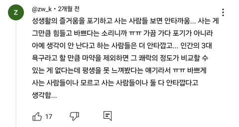 ㄹㅇ 짐승같음.. 사람마다 성욕이 다른건데 윽 그걸 굳이 즐겨야됨..? 진심으로 좋아하는 사람이랑만 해도 충분한거지 뭘