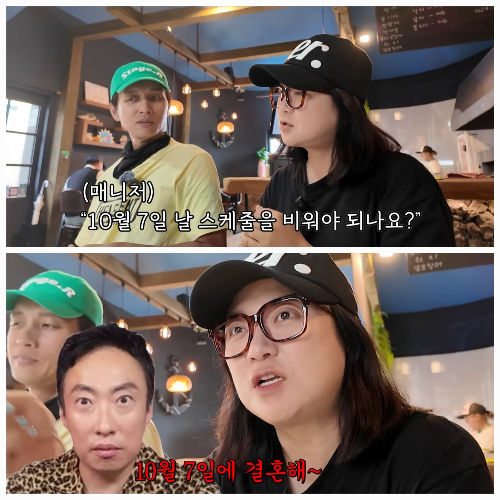 이날 김숙이 “매니저가 운전 중 갑자기 ‘10월 7일 스케줄 비워야 하냐’고 묻더라”며 결혼설 후일담을 전했다. “그날 결혼식이라면서 스케줄 빼냐고 묻더라”며 폭소했고, 구본승은 “결혼식 날짜도 이제 공식인가”라며 장난스럽게 받아쳤다. 피곤한 듯 무표정으로 웃음을 자아낸 장면도 포착됐다.