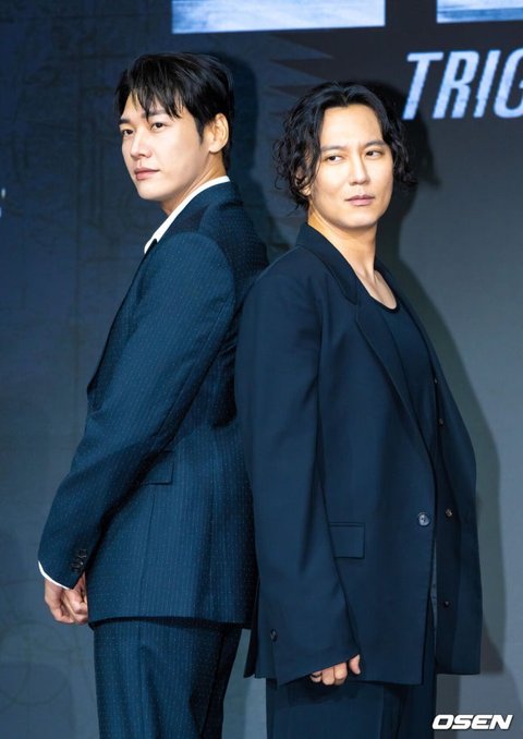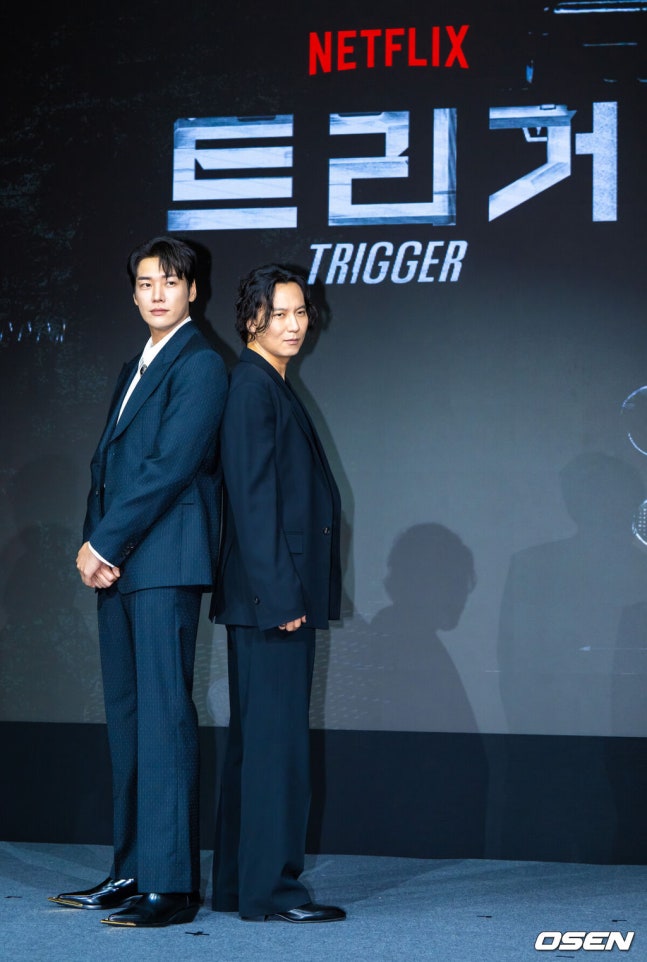 [OSEN=박준형 기자] 22일 서울 호텔 나루 서울 엠갤러리에서 넷플릭스 시리즈 '트리거' 제작발표회가 진행됐다.배우 김남길과 김영광, 길해연, 박훈이 출연하는 ‘트리거’는 총기 청정국으로 불리는 한국에서 갑자기 출처를 알 수 없는 불법 총기가 배달되기 시작하면서 벌어지는 이야기다. 배우 김남길과 김영광이 포즈를 취하고 있다. 2025.07.22 / soul1014@osen.co.kr김남길과 김영광의 투샷이 공개된 뒤 드라마 팬들의 시선을 사로잡기도 했던 바. 김남길은 "제가 생각했을 때 김영광 배우가 전에 한 작품들을 봤을 땐 로맨스물에 특화된 배우라 생각했다. 어떻게 보면 우리가 장르물을 같이 만나게 됐을 때 한 번도 보지 못했던 포텐이 터지는 것 같았다. 여즉 보지 못했던 이미지 톤들을 보여줘서 같이 하면서도 신선함에 좋았다. 이걸 보시는 분들도 그런 의미에서 반가울 수 있겠다고 생각했다"라고 말했다.