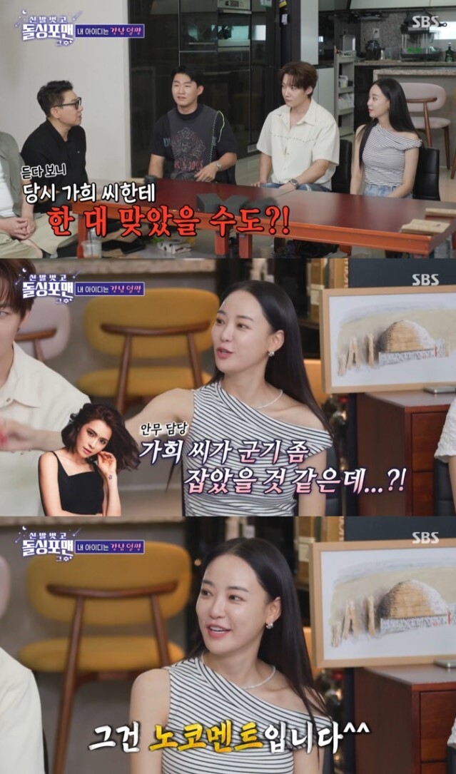SBS ‘신발 벗고 돌싱포맨’ 방송화면 캡처 녹화 현장에서는 애프터스쿨 내 분위기에 대한 언급도 나왔다. MC 이상민이 “그럼 가희 씨한테 한 대 맞았을 수도 있겠다. 춤 담당은 그런 부분에 예민하지 않나”고 묻자, 이주연은 웃으며 “그건 노코멘트”라고 받아쳐 궁금증을 자아냈다.