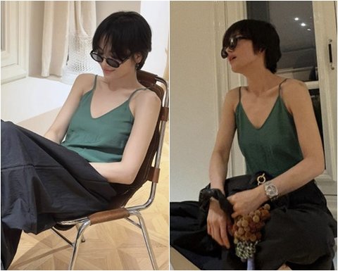 사진 속 송혜교는 짧은 숏컷 헤어스타일에 민소매 탑과 편안한 팬츠 차림으로, 내추럴하면서도 감각적인 스타일링을 완성했다. 선글라스를 착용한 채 포즈를 취하는 그의 모습은 마치 화보를 방불케 했다.