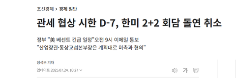 한국과 미국은 8월 1일 상호관세 발효를 앞두고 25일 미국 워싱턴DC에서 ‘2+2 통상협의’를 열 예정이었다. 구 부총리와 여한구 산업통상자원부 통상교섭본부장 등 우리 측 2명이,스콧 베선트 미 재무장관과 제이미슨 그리어 무역대표부(USTR) 대표 등 미국 측 2명이 참석하기로 해 ‘2+2 협의’라고 부른다.