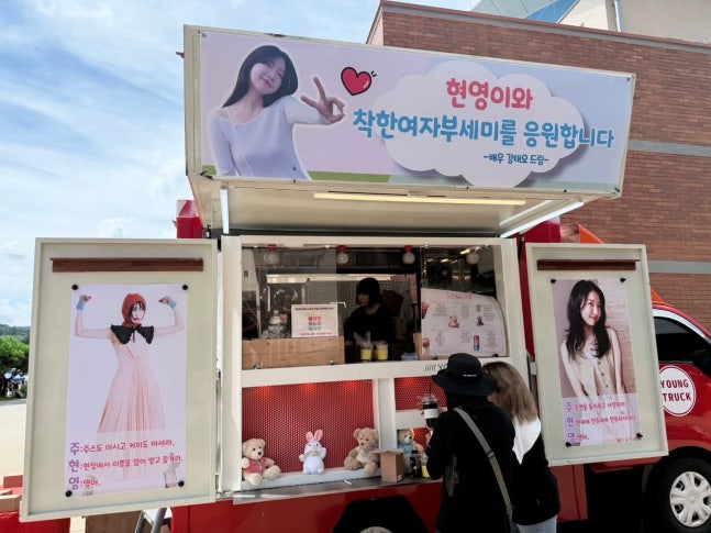 이어진 사진에서는 '현영이와 '착한 여자 부세미'를 응원합니다' 라는 문구가 적힌 커피차의 전체 모습이 담겼는데, '이상한 변호사 우영우'로 인연을 맺은 강태오가 응원 차 커피차를 보냈음이 드러나 보는 이들을 흐뭇하게 한다.