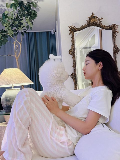 기은세는 집 안 소파에 기대듯 앉아, 환한 크림색의 반려견을 두 손으로 다정하게 감싼 채 시선을 맞췄다. 파스텔톤 스트라이프 파자마와 심플한 흰색 반소매 티셔츠가 내추럴한 분위기를 연출했으며, 손에 끼인 반지는 은은한 포인트가 됐다. 등 뒤에 둥글게 늘어진 대형 식물과 세심한 프레임의 빈티지 거울, 옅은 커튼과 따뜻한 스탠드 조명이 거실의 여름 저녁을 차분하게 채웠다. 기은세의 느긋하면서 우아한 표정은 반려견에 대한 깊은 애정과 긴 하루 끝 소소한 위로를 담아냈다.