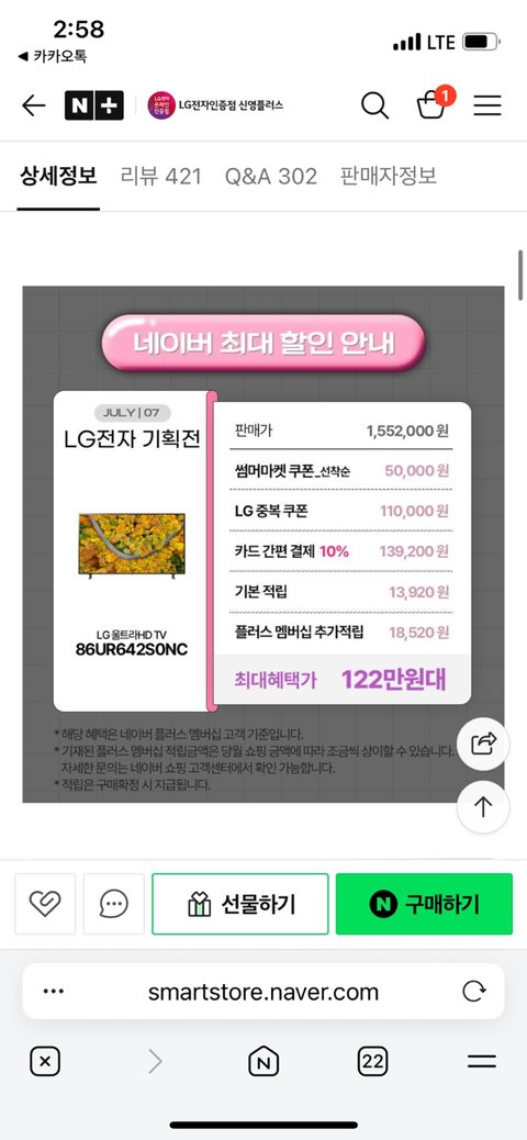 쿠폰, 카드할인, 멤버십 추가적립까지 하면 122만원대이만큼 큰 티비가 이정도 가격에 나온건 처음보네요카드할인은 농협, 네이버현대카드, 국민, 삼성 되는데농협, 네이버카드가 3만원 더 할인해주고요쿠폰은 썸머마켓이라고 네이버에서 하는거 있는데매일 아침 9시, 오후 6시 이렇게 두번 뿌린대요