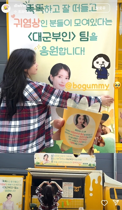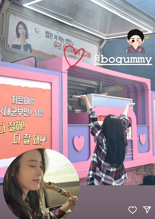 아이유는 26일 자신의 SNS를 통해 MBC 드라마 ‘21세기 대군부인’ 촬영장에서 받은 간식차 인증샷을 공개했다.
