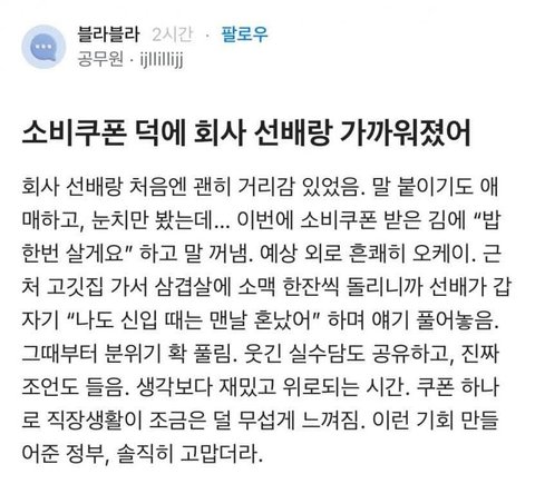 소비쿠폰으로 평소 불편했던 선배와 가까워져보세요