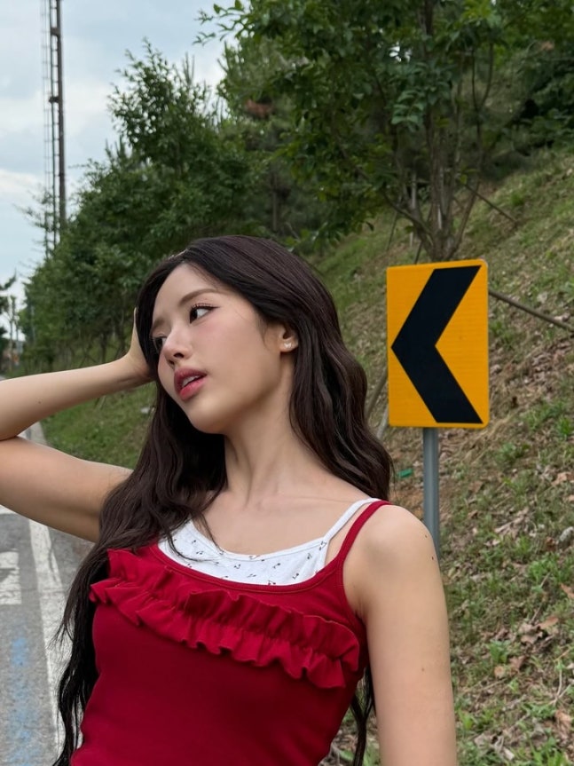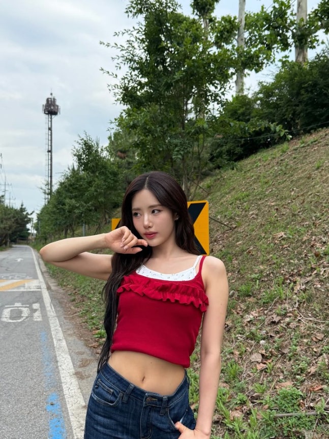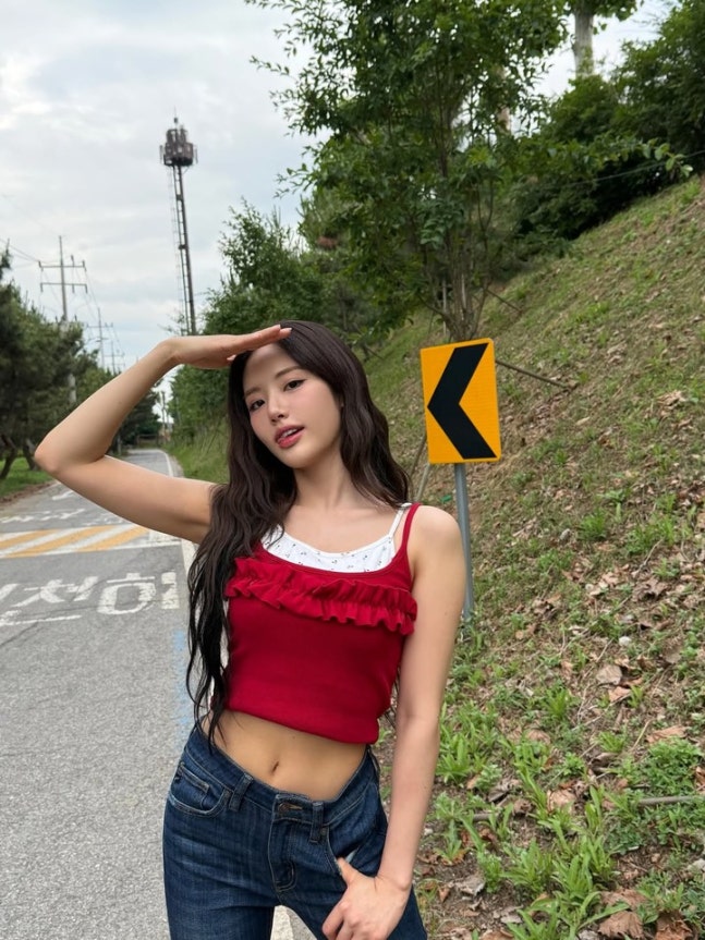 마지막 컷에서는 허리를 강조한 포즈로, 전체적인 실루엣이 더욱 강조된다. 하이웨이스트 데님과 레드 톱의 조합은 캐주얼한 무드를 자아낸다. 자연광 아래에서도 피부 결이 맑게 드러나며 완성형 비주얼을 자랑한다.