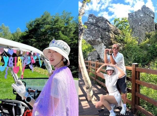 골프 카트 앞에서 찍은 또 다른 사진에선 최여진의 생일 분위기가 물씬 묻어났다. 카트에는 알록달록한 “HAPPY BIRTHDAY” 가랜드가 걸려 있고, 최여진은 반짝이는 보라색 망사 케이프와 왕관 모자를 쓴 채 활짝 웃으며 ‘생일 공주’처럼 꾸민 모습이었다.