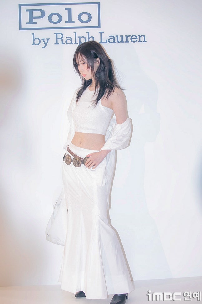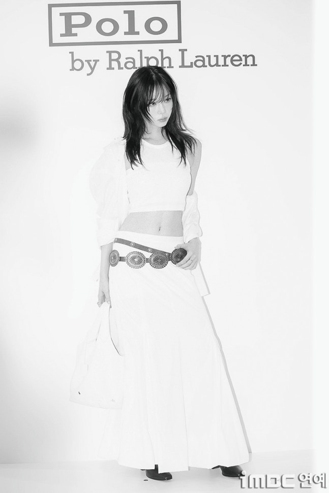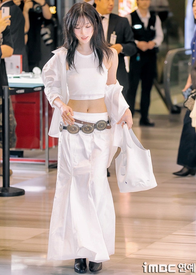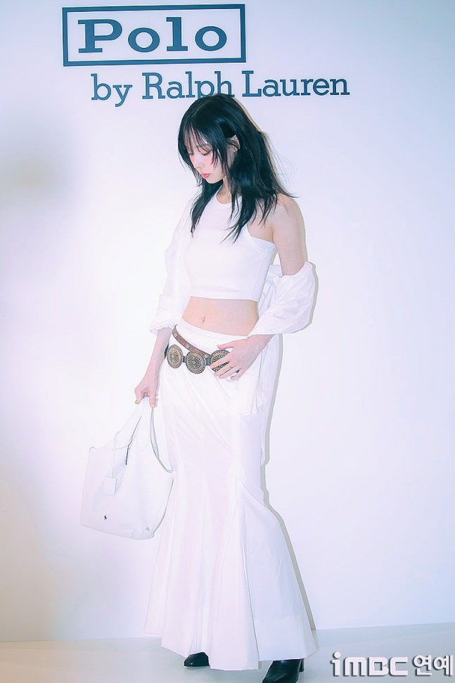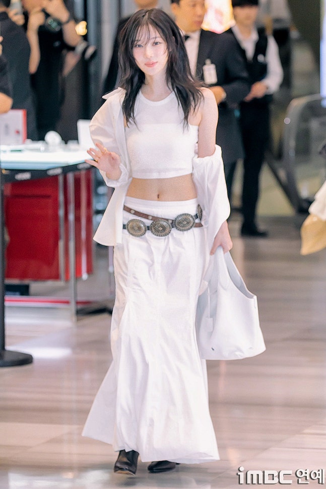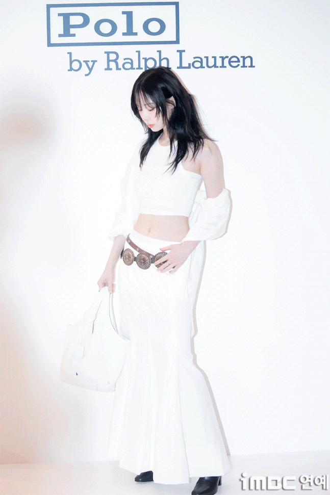 화이트 탱크톱과 걸을 때마다 돋보인 롱 주름 스커트. 화이트 재킷을 살짝 걸치고 어깨를 드러낸 자연스러움과 퇴폐미의 그 중간. 빈티지 벨트를 포인트로 마치 코스프레를 한듯한 패션에 '진격의 거인' 작중 캐릭터 '미카사'와 '유미르 시조'의 분위기와 어울렸다.