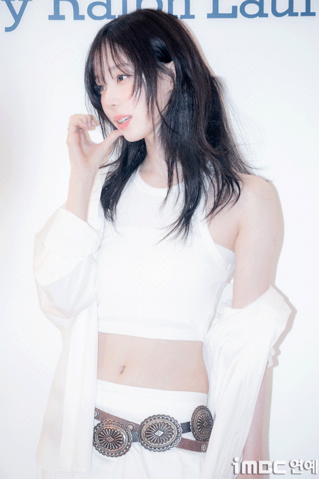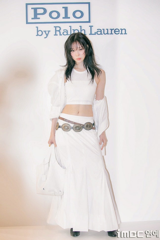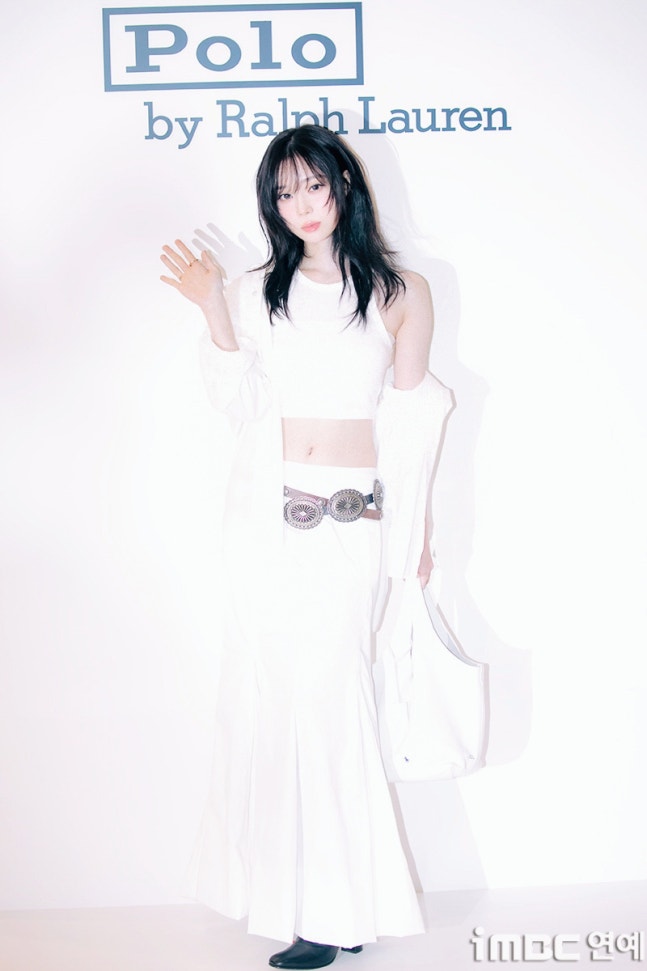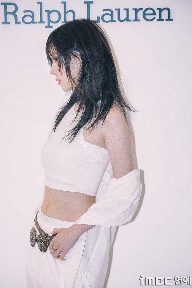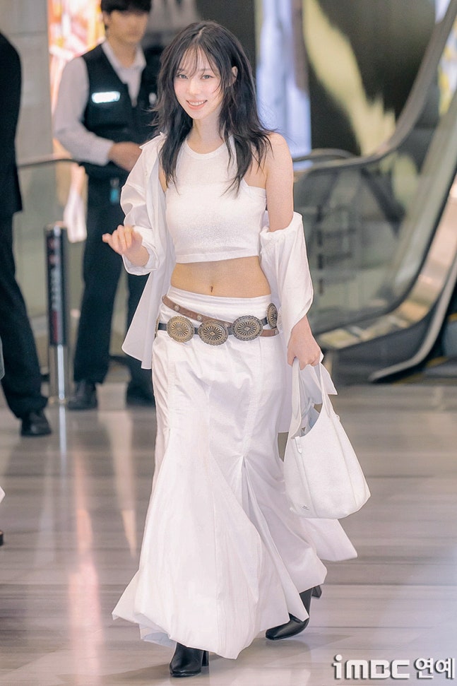 화이트 탱크톱과 걸을 때마다 돋보인 롱 주름 스커트. 화이트 재킷을 살짝 걸치고 어깨를 드러낸 자연스러움과 퇴폐미의 그 중간. 빈티지 벨트를 포인트로 마치 코스프레를 한듯한 패션에 '진격의 거인' 작중 캐릭터 '미카사'와 '유미르 시조'의 분위기와 어울렸다.